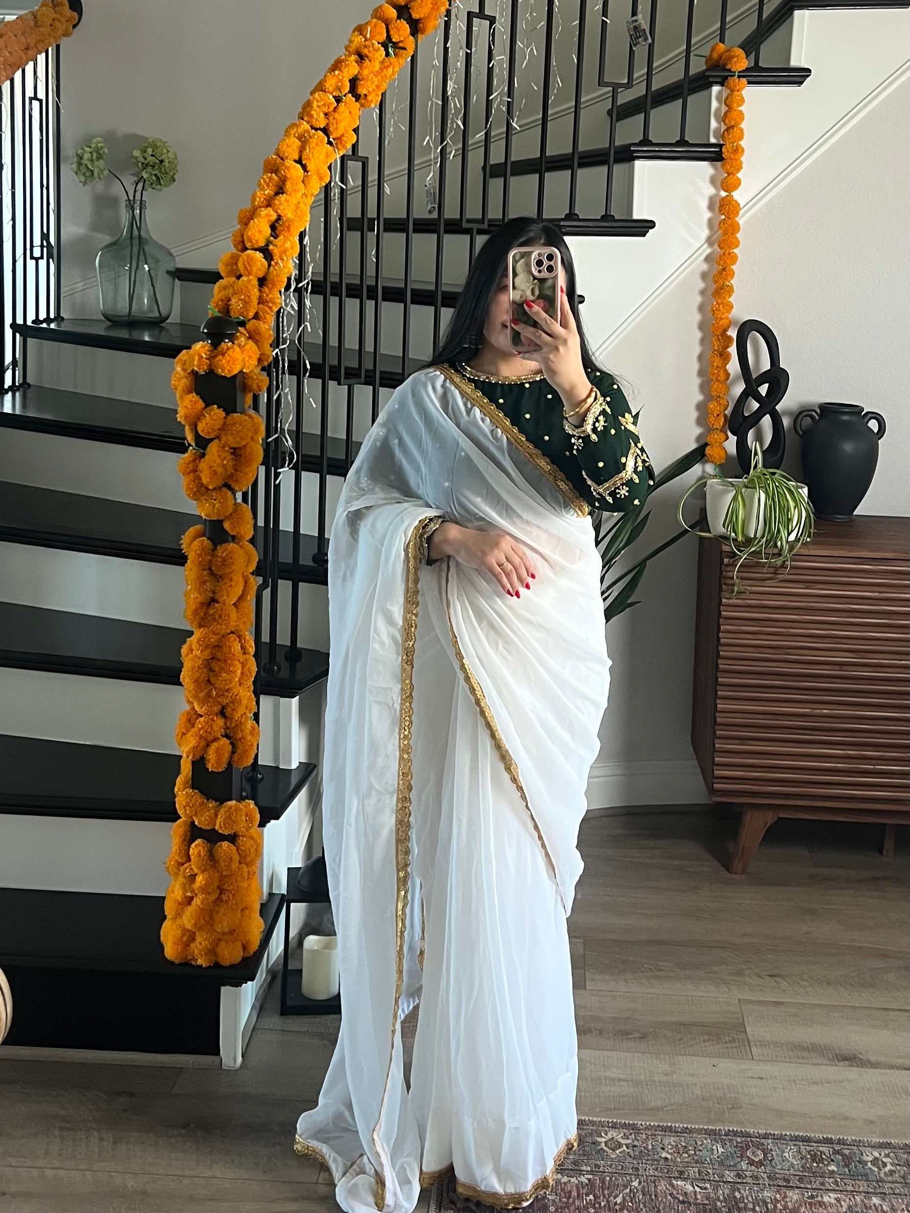 Make a striking statement with this easy to wear handwork boutique saree and blouse set crafted from lightweight and flowing georgette. It's ready to wear offering both comfort and grace. Perfect for festive occasions, elegant gatherings, or making a memorable impression. Comes with a green heavy boutique work blouse piece, completing this captivating ensemble.