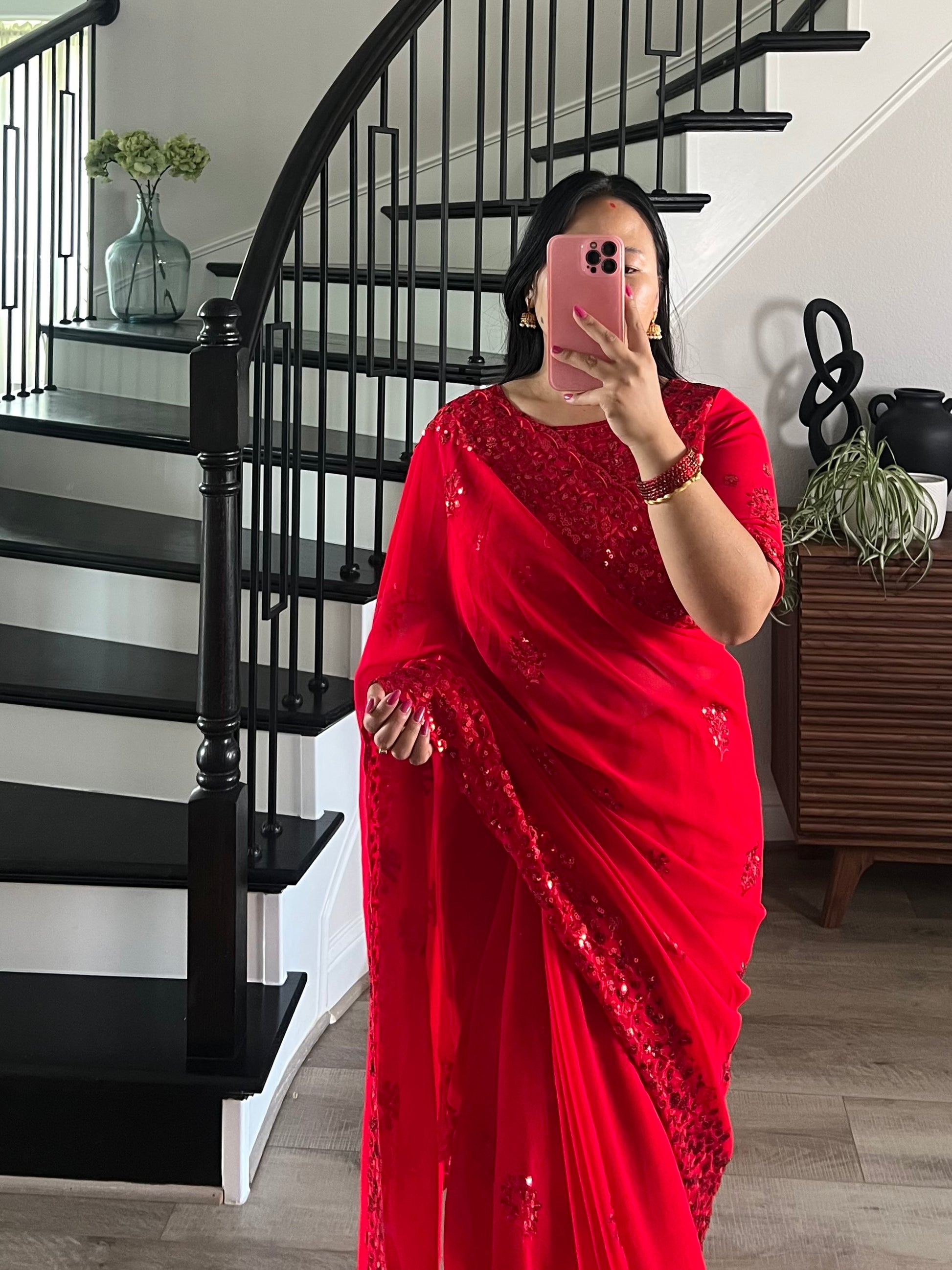 Make a striking statement with this exquisite red georgette saree crafted from lightweight and flowing georgette. It has heavy Water Sequence work in all over saree and border.