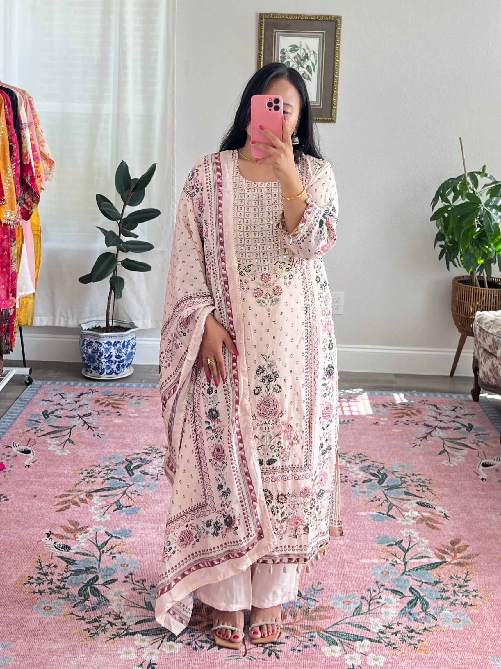 Step into effortless elegance with our stunning three-piece suit, a perfect blend of traditional charm and contemporary style. Crafted from silk fabric, this beautiful ensemble features intricate floral pattern with zari and sequin work.