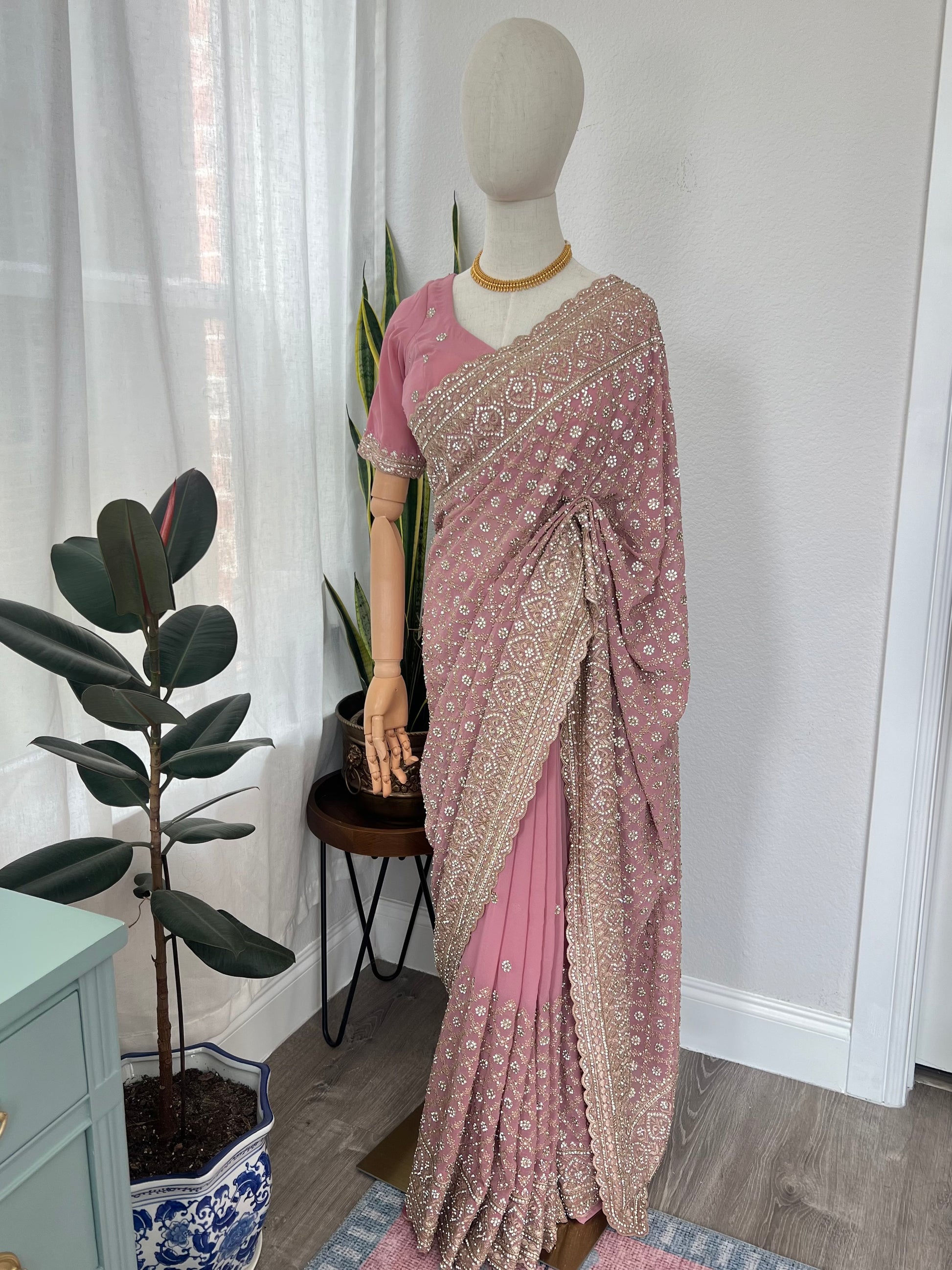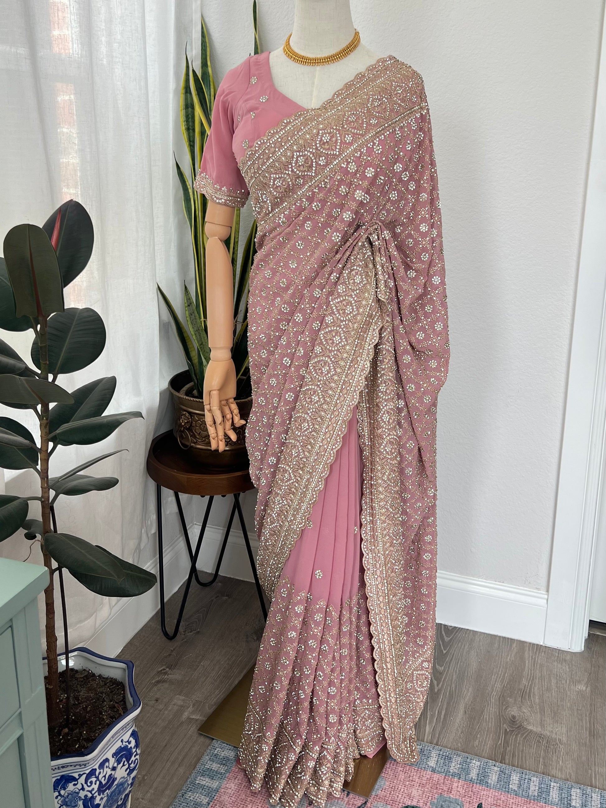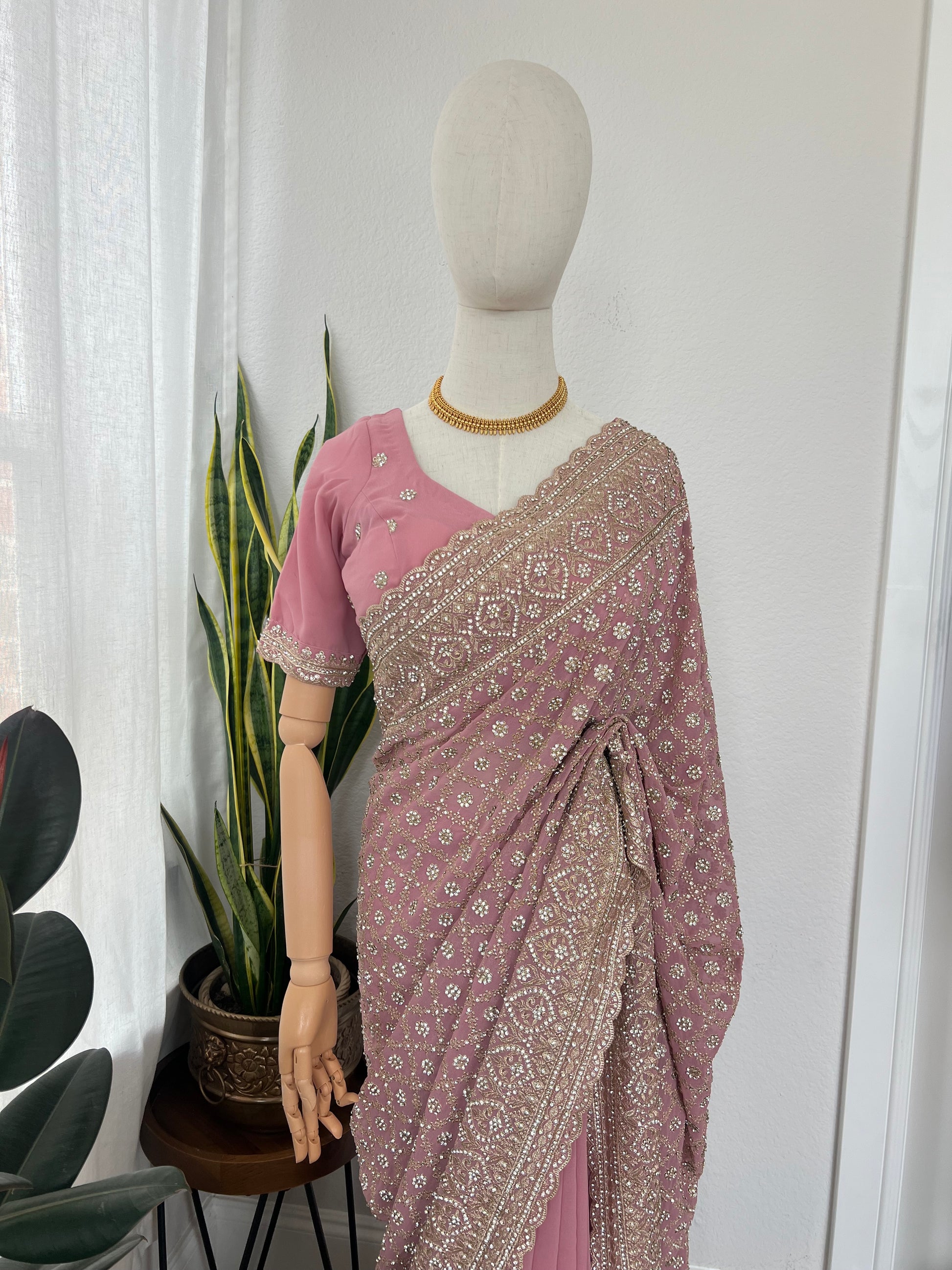 Make a striking statement with this exquisite heavy georgette saree crafted from lightweight and flowing georgette, it drapes beautifully, offering both comfort and grace. Perfect for festive occasions, elegant gatherings, or making a memorable impression. Comes with a matching blouse piece, completing this captivating ensemble.