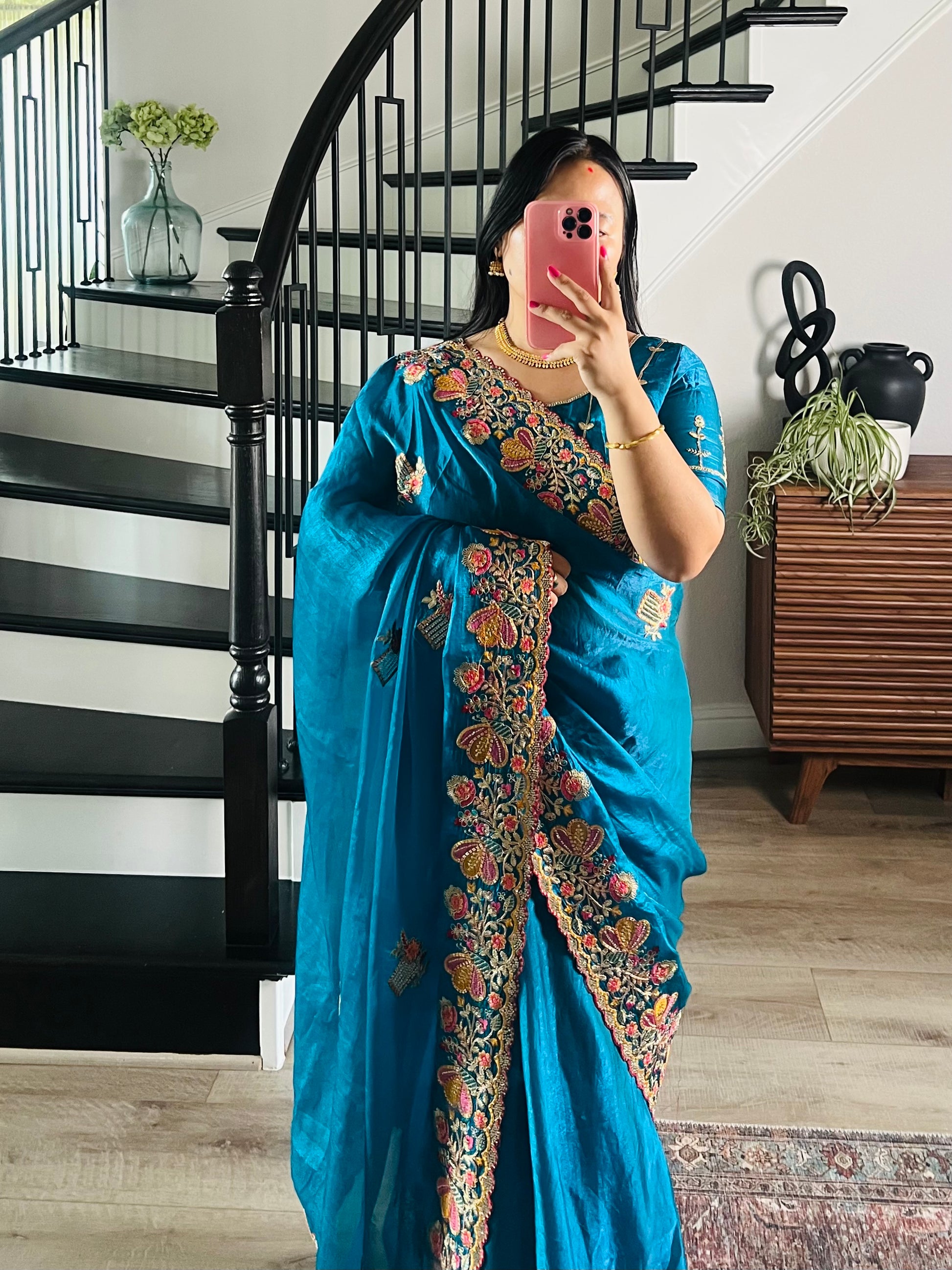 Drape yourself in elegance with this stunning teal blue silk saree, a perfect blend of traditional charm and contemporary style. The rich, vibrant hue of the saree is beautifully complemented by an elaborate floral embroidery that graces the borders and pallu.