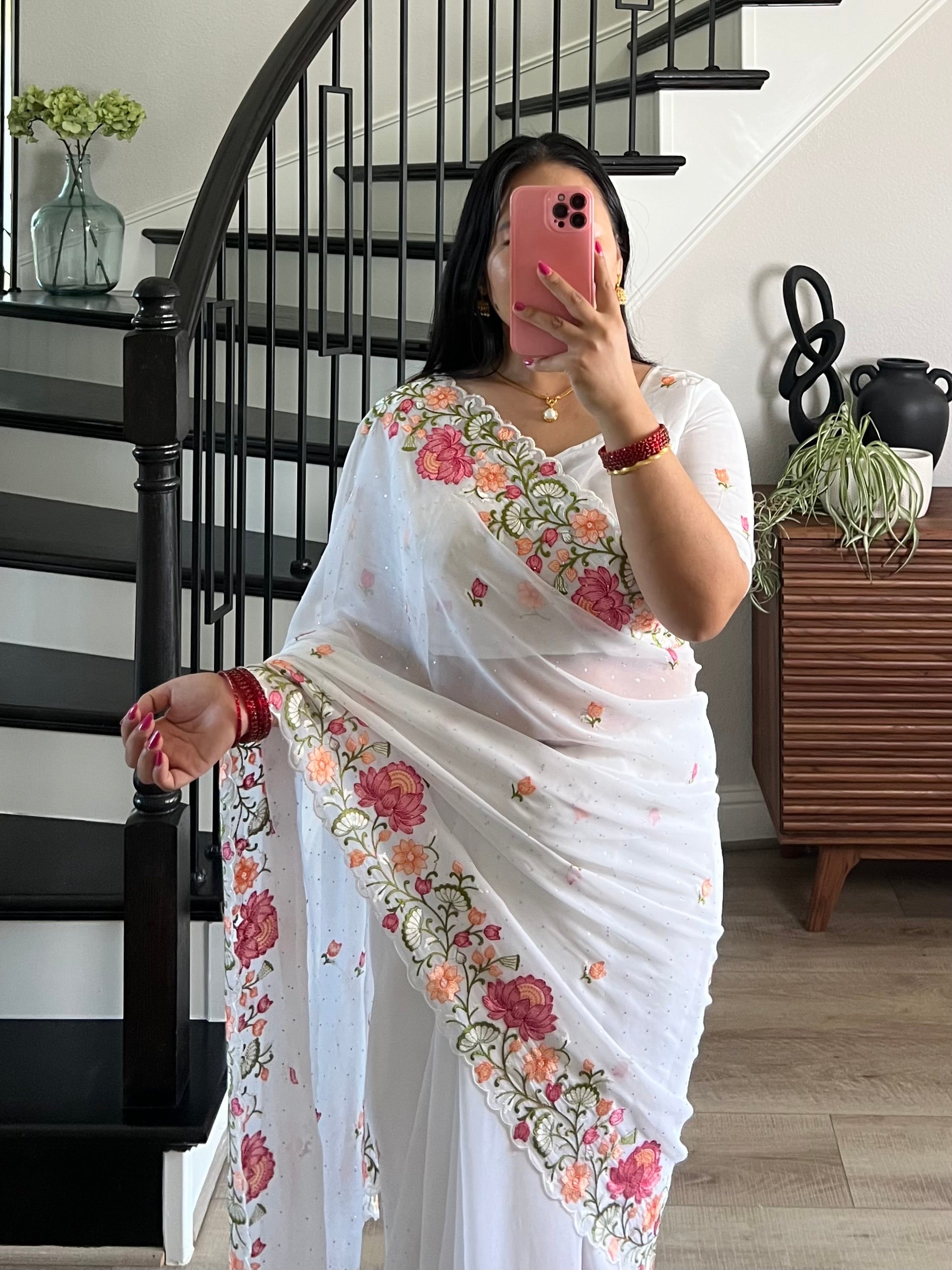 Unveil a vision of sophisticated charm with our stunning white georgette saree, exquisitely adorned with vibrant pink floral embroidery. This saree is beautifully contrasted by delicate yet striking blooms and foliage, creating a timeless and elegant design. Crafted from lightweight and flowing georgette, this saree drapes beautifully, offering both comfort and graceful movement. Perfect for evening events, festive celebrations, or a memorable appearance, this saree comes with a matching blouse piece, completing an ensemble that's sure to turn heads.